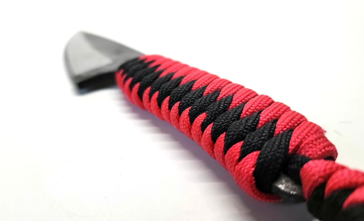Montage : tressage paracorde rouge et noir, prise ferme et sécurisante, bon grip même mains humides.