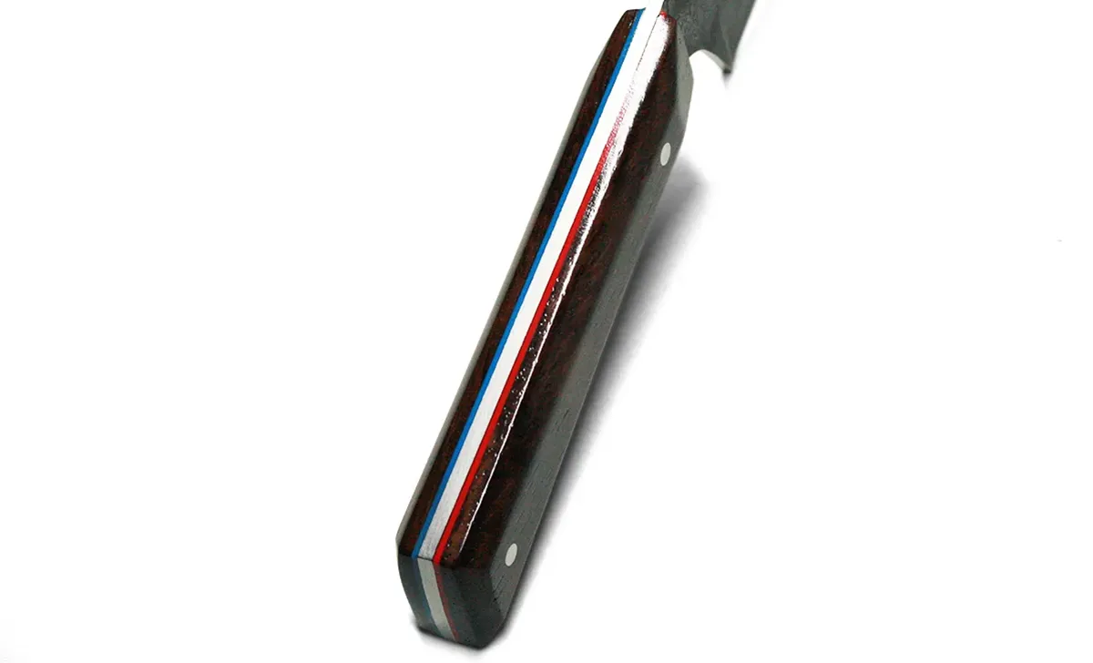 Couteau chef inspiré de la gamme de couteaux de cuisine Européen. La géométrie et les dimensions de la lame en font un couteau très polyvalent pour la cuisine. Détailler des légumes, couper des pièces de viande sont particulièrement adaptés à sa forme. La lame, réalisée en XC75, a subit une trempe sélective selon la méthode japonaise Yaki-ire et lui conférent des propriétés mécaniques remarquables. Ce procédé, qui consiste à enduire partiellement la lame d’argile avant la trempe, permet d’obtenir un couteau à la fois résilient et un tranchant très dur. Cette technique ancestrale japonaise est utilisé notamment pour réaliser des sabres (Katanas) aux performances exceptionnelles. Esthétiquement, le hamon forme des nuances visibles après une révélation au vinaigre blanc et polissage fin. On peut y distinguer des vagues, des nuages qui donnent un caractère unique à ce couteau.
