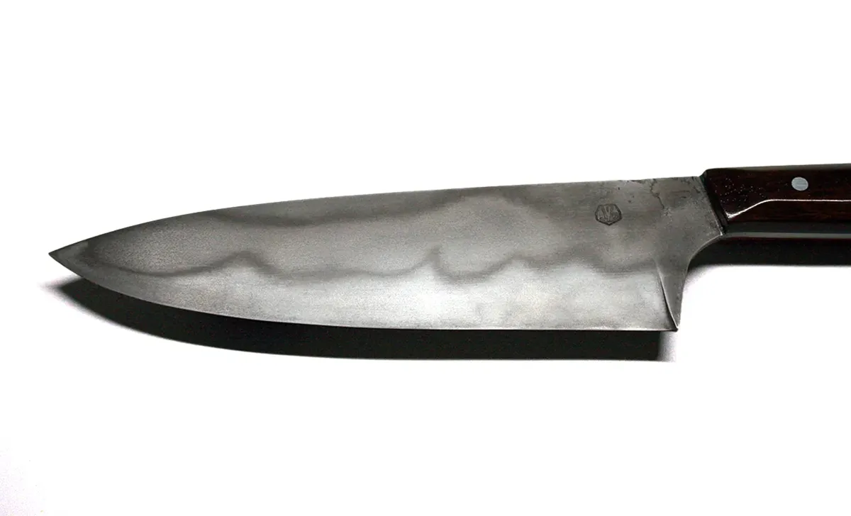 Les lames en acier carbone sont réputées pour leur excellente coupe et leur affûtage facile. Elles atteignent des duretés supérieures à celles réalisées en acier inoxidable. Cependant l’acier carbone s’oxyde et se patine. Ainsi il faut veiller à les rincer rapidement après usage, les sécher entièrement, puis les huiler très légèrement si la lame ne ressert pas sous 24–48 h (camélia ou huile minérale alimentaire). La patine est normale, elle donne du charme et un caractère unique à l’acier carbone. Éviter lave-vaisselle, trempage, stockage humide et produits chlorés. Pour un stockage long il faut s’assurer que la lame soit sèche et légèrement huilée.