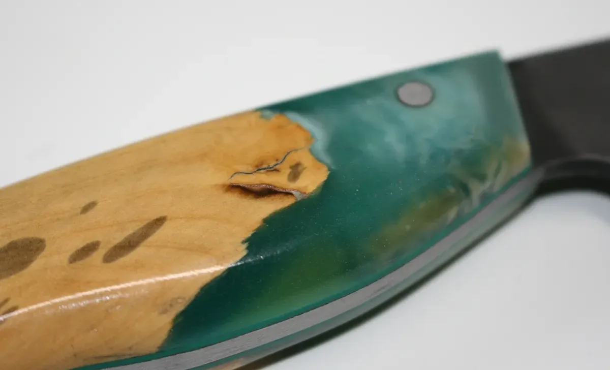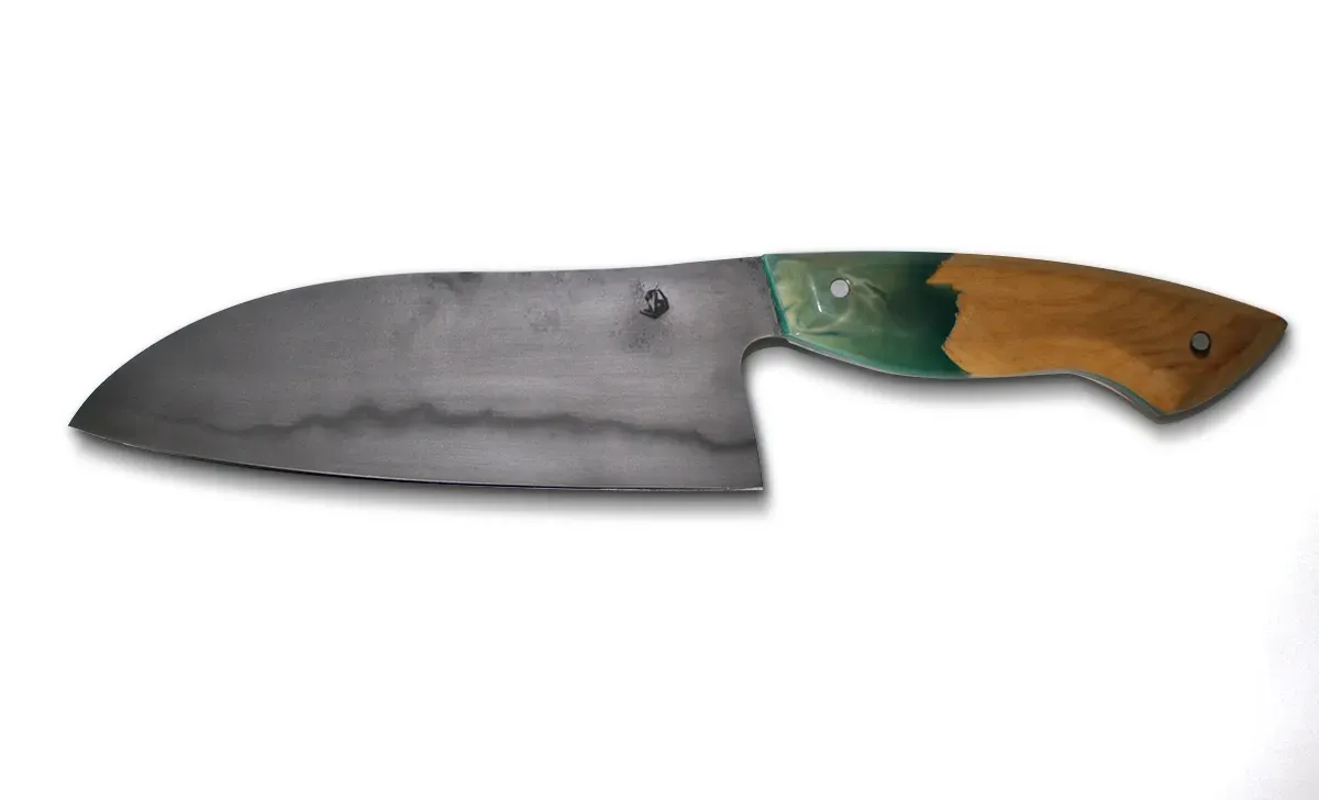 Son manche ergonomique marie une résine époxy bleu/vert à un bois de houx clair, monté sur des intercalaires en fibre vulcanisée vert d’eau assortis : un contraste très contemporain pour une pièce unique qui assume sa personnalité en cuisine.