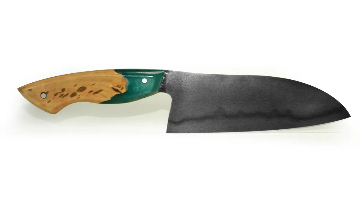 J’ai également confectionné le manche en coulant la résine époxy que j’ai préalablement teintée en bleu. Le reflet du bois de houx clair lui confère une teinte vert d’eau très organique. Le résultat est un couteau moderne mais qui conserve les codes des santoku traditionnels, efficace et très expressif. Je l’ai pensé comme la pièce maîtresse en cuisine.