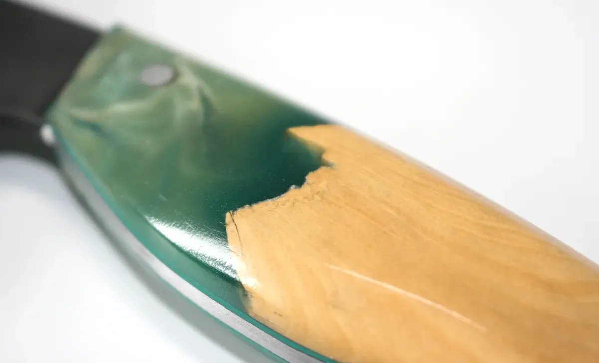Matériaux : Résine époxy teintée bleu/vert, profonde et lumineuse. Bois de houx clair, veiné de taches naturelles qui apportent caractère et chaleur.